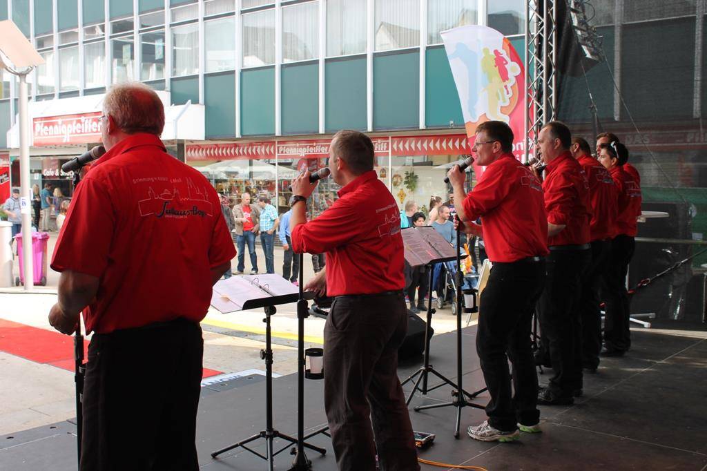 In diesem Jahr hatten wir mal Glück mit unserem Auftritt vor dem Rathaus. Die Sonne lachte, die Zuhörer waren zahlreich auf dem Rathausplatz vorhanden und alle hatten viel Spaß. Während unseren 3,5 Stunden reine Auftrittszeit, haben wir gemeinsam mit dem Publikum gesungen, geklatscht und viel Spaß gehabt. Im Gegensatz zu den letzten beiden Jahren, an denen jeweils bei kalter Witterung und Regen kaum Zuschauer unseren Auftritt begleiteten (lediglich unsere Fan-Clubs - Danke für die Treue), waren es in diesem Jahr vollbesetzte Stühle und eine prächtige Kulisse.