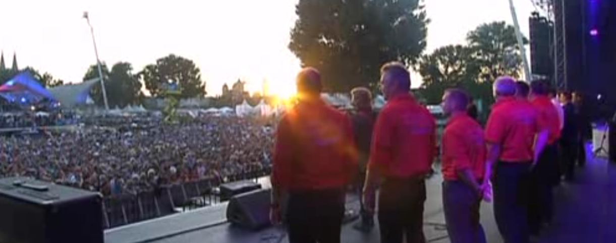 Dann hieß es "Abmarsch" zur Hauptbühne. Gemeinsamer Auftritt aller Teilnehmer der Talentshow und dann wurde mit den Höhnern und Josephine das Lied "Festpiraten" vor einer wahnsinnigen Kulisse mit 10.000 Zuschauern - Sonnenuntergang und Blick auf dem Dom - gesungen. Ebenfalls einfach nur Wahnsinn und ein super Spaß. Leider hatten wir dieses Mal für 9 Sänger sogar nur zwei Mikros zur Verfügung - was uns aber nicht den Spaß an der Sache verderben konnte.